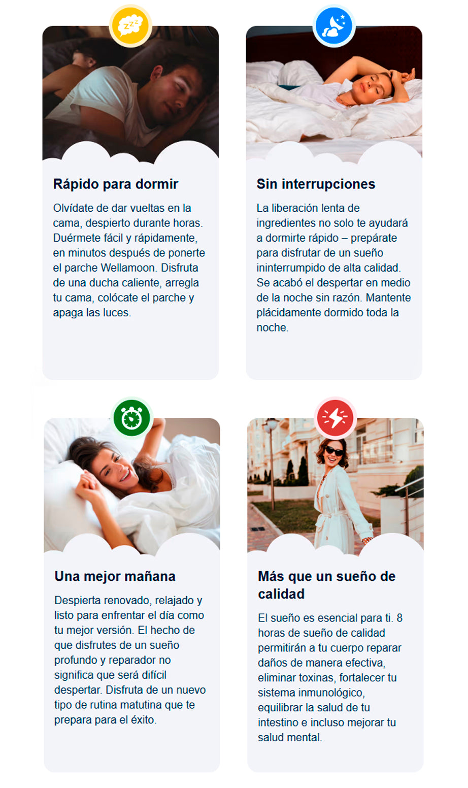 Wellamoon es un parche no invasivo que mejora el sueño y está potenciado por ingredientes probados a lo largo del tiempo. Te ayuda a conciliar el sueño fácilmente, a mantenerlo durante toda la noche y a mejorar la calidad general del sueño sin causarte somnolencia por la mañana.